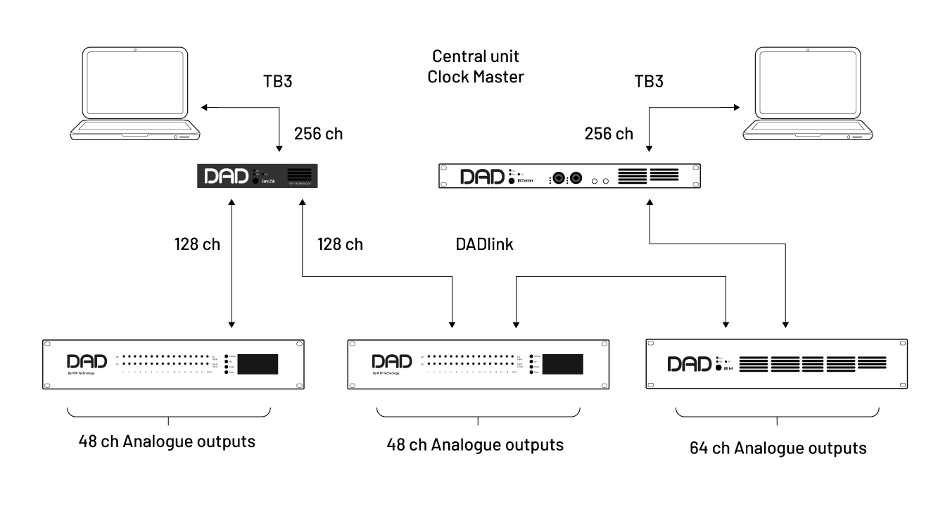 In systems with more units interconnected, one unit should be the clock master and the other units need to synchronize to the DADlink input in order to assure that all units has the same clock and time stamp reference. This is automatically distributed between all units via the DADlink connection.