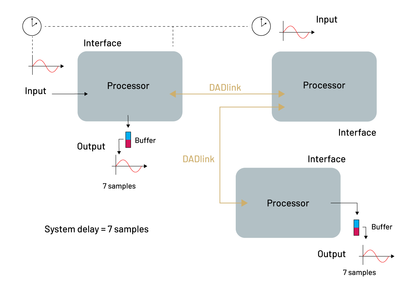 This system relies on all input signals being provided with a time stamp when sampled, and each output interface having a buffer system, which aligns the signal to the same latency equal to the system delay, which you can set via the DADman control software.